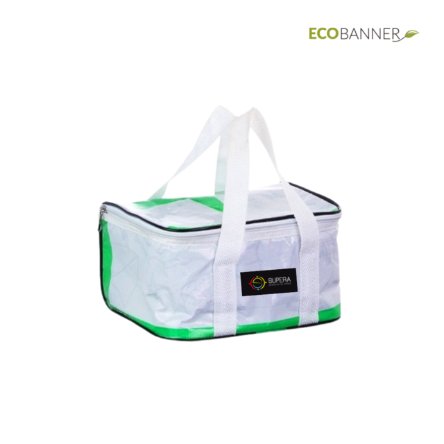 Marmita feita de banner reaproveitado colorido com alça em nylon, acabamento em vivo e espaço interno revestido com manta térmica e impermeável. Fechamento por zíper na parte superior.